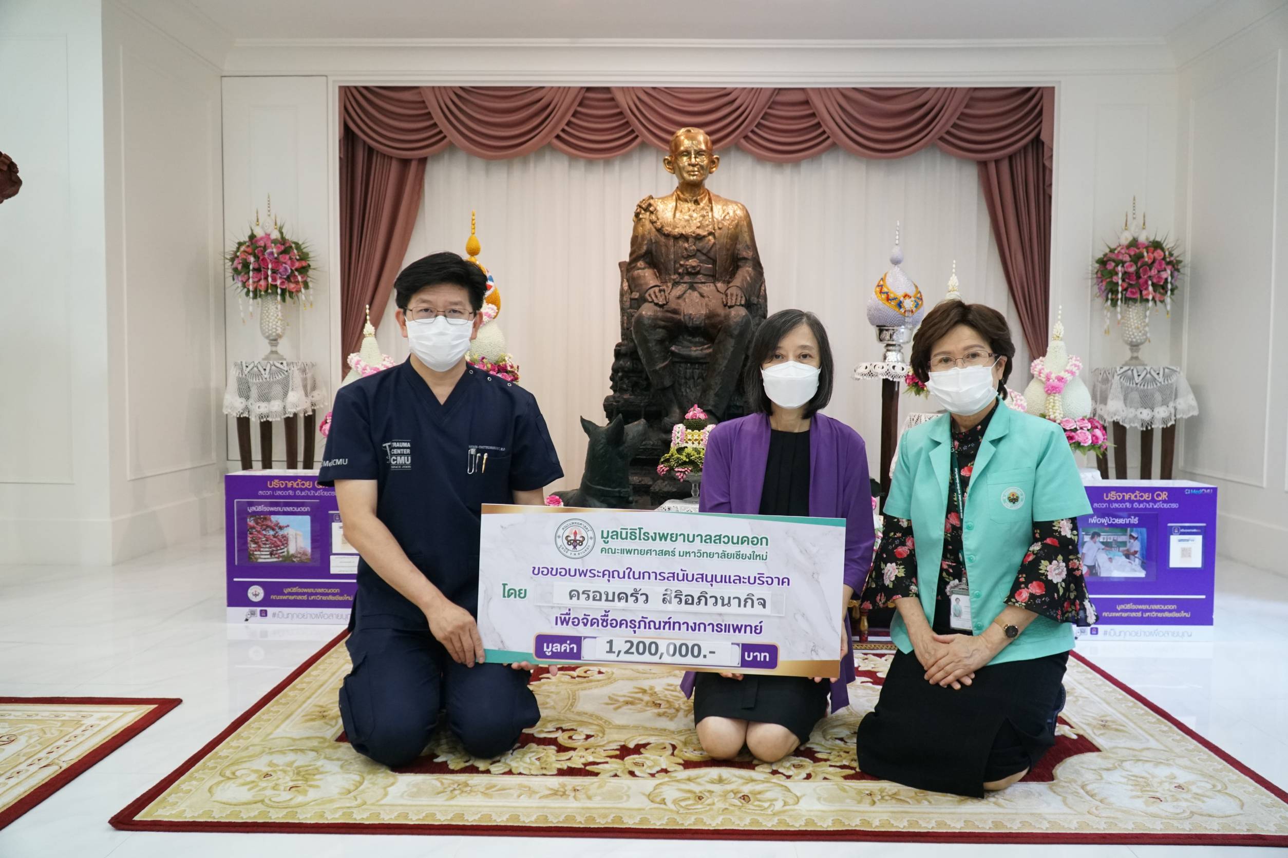 ผศ.พญ.วัชรี ตันติประภา เป็นผู้แทนคุณอริสา , คุณอโรชา และคุณอารยา สิริอภิวนากิจ มอบเงินบริจาค จำนวน 1,200,000 บาท สมทบทุนมูลนิธิโรงพยาบาลสวนดอก เพื่อผู้ป่วยไวรัสโควิด-19 สำหรับจัดซื้อเครื่องติดตามการทำงานของหัวใจและสัญญาณชีพ จำนวน 3 เครื่อง โดยมี ผศ.นพ.นเรนทร์ โชติรสนิรมิต ผู้อำนวยการโรงพยาบาลมหาราชนครเชียงใหม่ รับมอบ เมื่อวันที่ 29 มิถุนายน 2564 ณ ศาลาใต้ร่มพระบารมี ชั้น 1 อาคารสุจิณโณ คณะแพทยศาสตร์ มช.