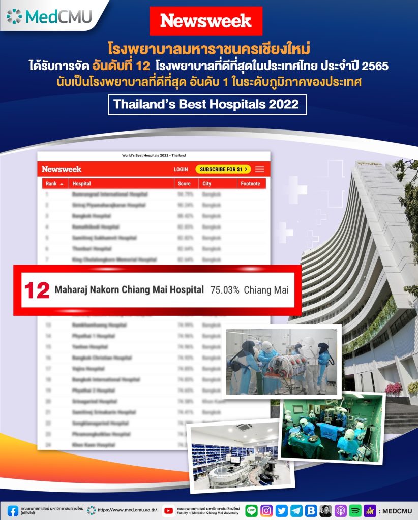ทั้งนี้ ในปี 2565 นี้ ประเทศไทย มีโรงพยาบาลที่ได้รับการจัดอันดับทั้งสิ้น 30 แห่ง โดยส่วนใหญ่เป็นโรงพยาบาลเอกชน สำหรับโรงพยาบาลมหาราชนครเชียงใหม่ คณะแพทยศาสตร์ มหาวิทยาลัยเชียงใหม่ ได้รับการจัดลำดับเป็นอับดับที่ 12 มีคะแนน 75.03ฝ% นับเป็นอันดับ 1 ของโรงพยาบาลที่ดีที่สุดในระดับภูมิภาคของประเทศไทย