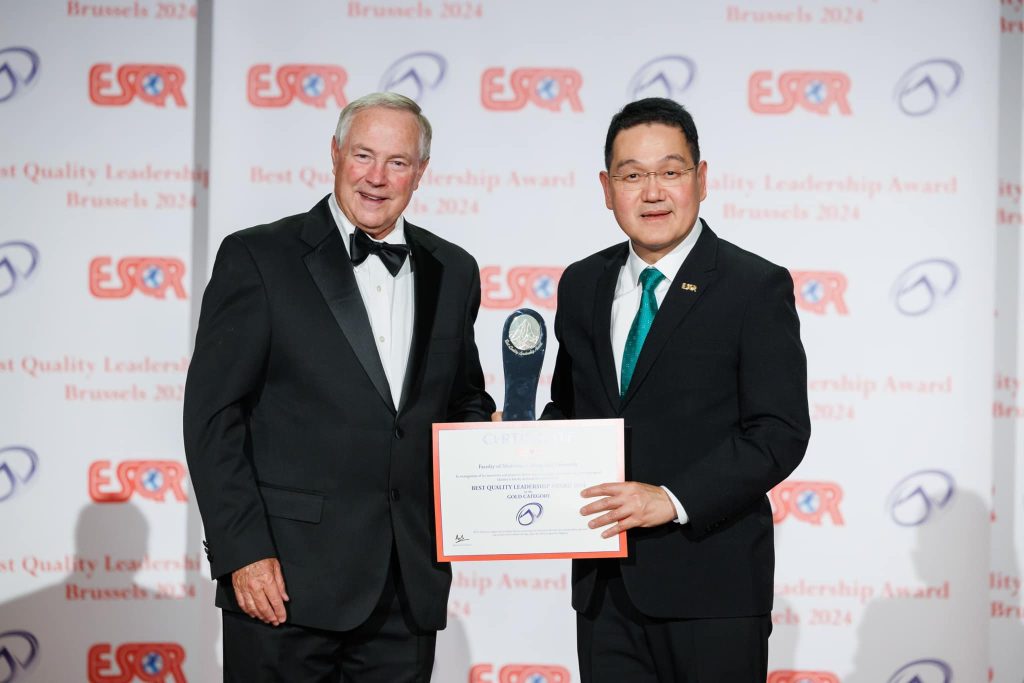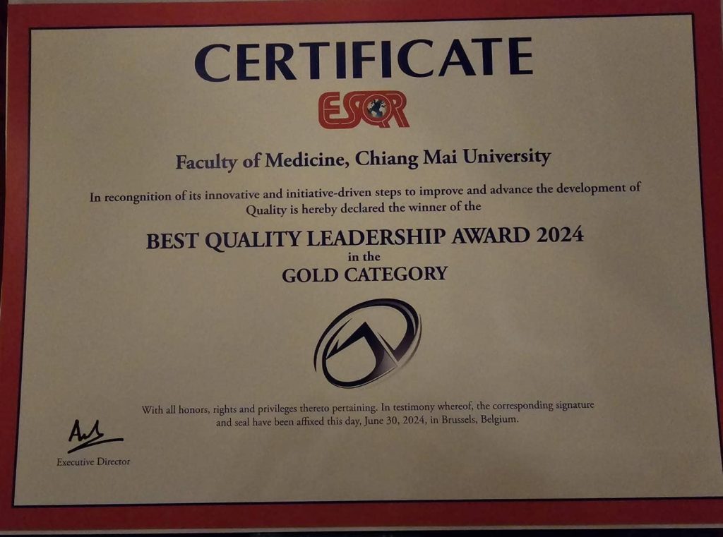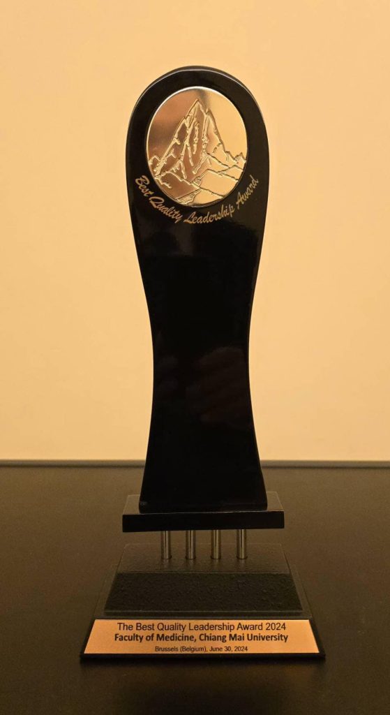 ศ.(เชี่ยวชาญพิเศษ)นพ.บรรณกิจ โลจนาภิวัฒน์ คณบดีคณะแพทยศาสตร์ มช. พร้อมด้วย ศ.นพ.มานิต ศรีสุรภานนท์ รองคณบดีด้านวิจัย, ผศ.ดร.อริสา บอนเนซซ์ รองคณบดีด้านการศึกษาหลังปริญญา และ รศ.ดร.นพ.ดำเนินสันต์ พฤกษากร ผู้ช่วยคณบดี รับผิดชอบงานงานวิจัยเชิงรุก ร่วมงาน The ESQR’s Best Quality Leadership Awards 2024 จากองค์กร European Society for Quality Research (ESQR) ณ ห้องประชุม Balloon Theatre โรงแรม Hotel Le Plaza เมืองบรัสเซลส์ ประเทศเบลเยียม เมื่อวันที่ 30 มิถุนายน 2567 เพื่อเข้ารับรางวัล The Best Quality Leadership Award 2024 ที่มอบให้กับคณะแพทยศาสตร์ มหาวิทยาลัยเชียงใหม่ รางวัลนี้เป็นรางวัลเพื่อยกย่ององค์กรที่มีแนวทางปฏิบัติ กลยุทธ์ การจัดการคุณภาพและการบริหารที่มีคุณภาพตามมาตรฐานสากล และมีความเป็นผู้นำที่โดดเด่น สร้างสรรค์นวัตกรรมเพื่อปรับปรุงและพัฒนาคุณภาพและนำมาใช้ในองค์กร ยกระดับการทำงาน และสร้างแรงจูงใจในการพัฒนาอย่างต่อเนื่อง ซึ่งนับเป็นรางวัลอันทรงเกียรติและทรงคุณค่าอย่างยิ่งของคณะแพทยศาสตร์ มหาวิทยาลัยเชียงใหม่