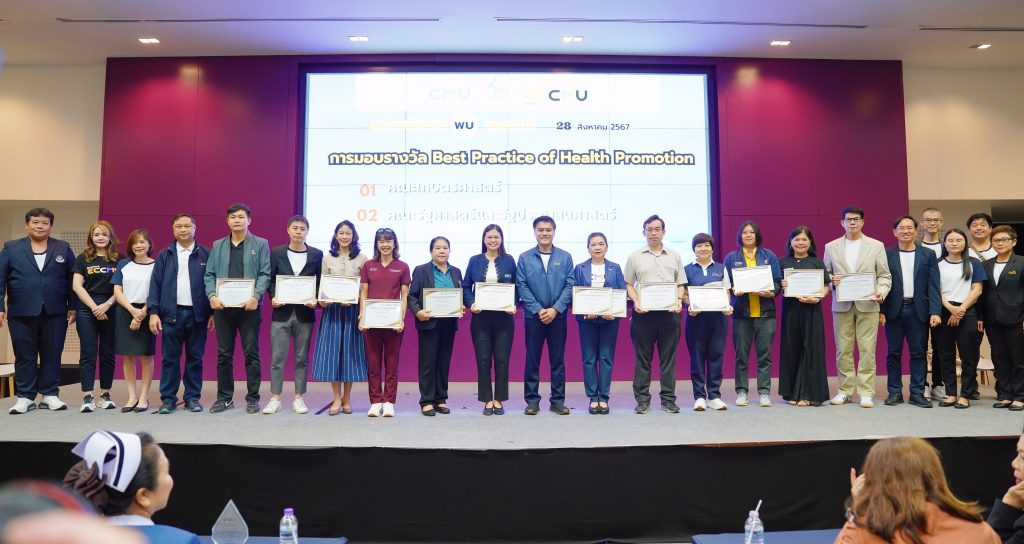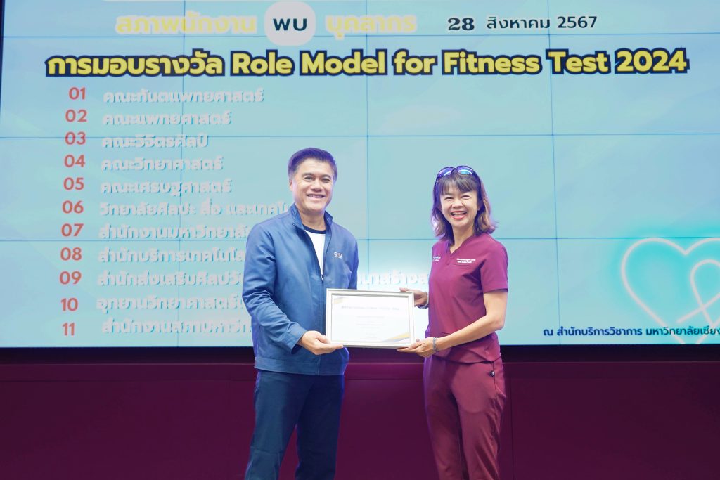 รศ.ดร.พญ.ศิริอนงค์ นามวงศ์พรหม ผู้ช่วยคณบดีคณะแพทยศาสตร์ มช. เป็นผู้แทนคณบดี รับมอบใบประกาศนียบัตร Role Model for Fitness Test 2024 ในโครงการ สร้างเสริมสุขภาพและสมรรถภาพทางกาย ของบุคลากรมหาวิทยาลัยเชียงใหม่ ประจำปี พ.ศ.2567 โดยมี ผศ.ดร.ปิติพงษ์ ยอดมงคล รองอธิการบดีมหาวิทยาลัยเชียงใหม่ มอบประกาศนียบัตร กิจกรรมดังกล่าวได้จัดให้มีการทดสอบสมรรถภาพทางกายของบุคลากรมหาวิทยาลัยเชียงใหม่ เพื่อเสริมสร้างสุขภาพร่างกาย จิตใจให้สมบูรณ์แข็งแรง การพบปะแลกเปลี่ยนเรียนรู้ร่วมกัน และเป็นการให้บุคลากรมีการดูแลสุขภาพของตนเอง เพื่อนำไปประยุกต์ใช้ในกิจกรรมออกกำลังกายในชีวิตประจำวัน ในวันที่ 28 สิงหาคม 2567 ณ ห้องประชุมทองกวาว ชั้น 2 สำนักบริการวิชาการ มช.