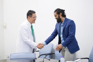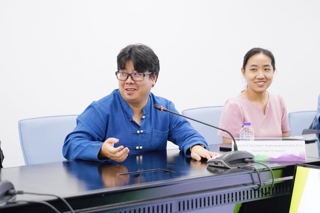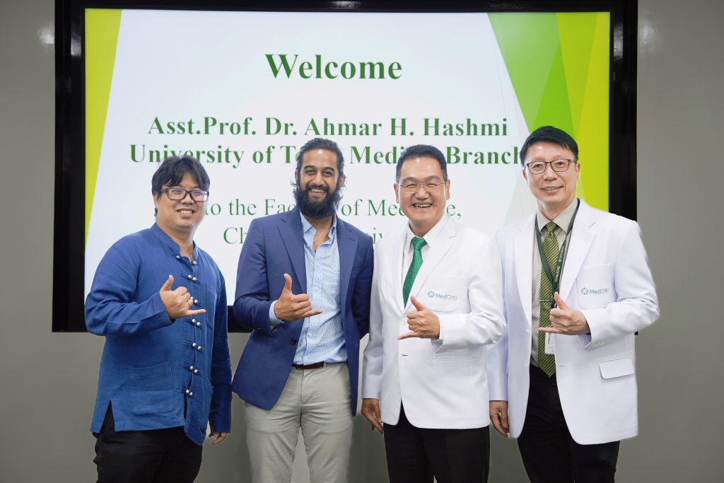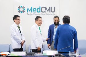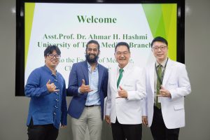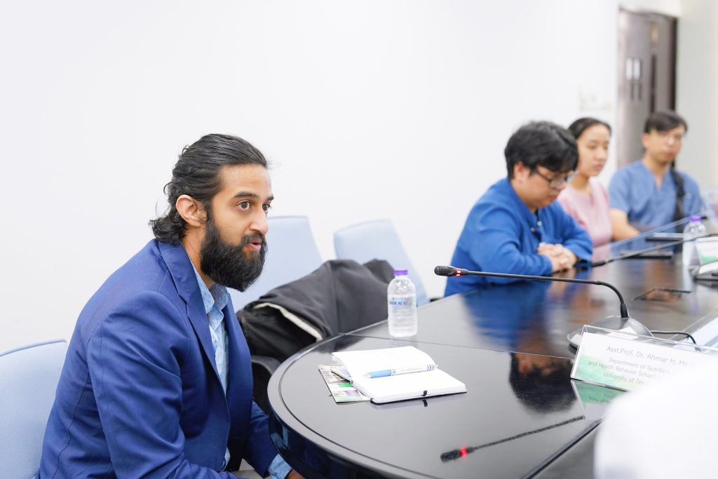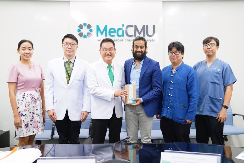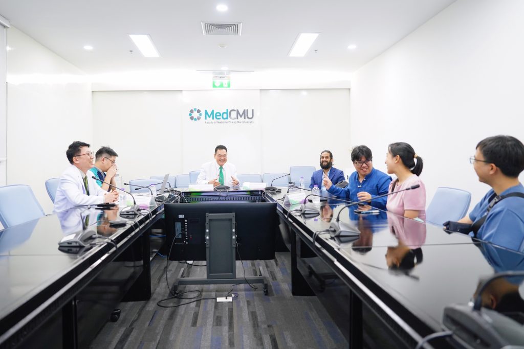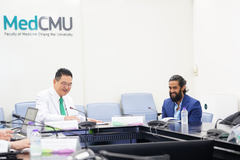 ศ.(เชี่ยวชาญพิเศษ)นพ.บรรณกิจ โลจนาภิวัฒน์ คณบดีคณะแพทยศาสตร์ มช. พร้อมด้วย ผศ.นพ.ฉลอง ชีวเกรียงไกร ผู้ช่วยคณบดีคณะแพทยศาสตร์ มช., รศ.ดร.นพ.ชัยสิริ อังกุรวรานนท์ ผู้ช่วยคณบดีคณะแพทยศาสตร์ มช. และนักวิจัยจากศูนย์วิจัย Global Health Research Center คณะแพทยศาสตร์ มหาวิทยาลัยเชียงใหม่ ให้การต้อนรับ Asst. Prof. Dr. Ahmar H. Hashmi, Department of Nutrition Sciences and Health Behavior School of Health Professions จาก University of Texas Medical Branch ประเทศสหรัฐอเมริกา ในโอกาสที่ Asst. Prof. Ahmar H. Hashmi เดินทางมาเยือนศูนย์วิจัย Global Health Research Center เพื่อหารือเกี่ยวกับกิจกรรมการแลกเปลี่ยนทางวิชาการ ระหว่างคณะแพทยศาสตร์ มช. กับ University of Texas Medical Branch อาทิ การแลกเปลี่ยนบุคลากร และการแลกเปลี่ยนงานวิจัย ในวันที่ 9 กันยายน 2567 ณ ห้องประชุม 802 ชั้น 8 อาคารราชนครินทร์ คณะแพทยศาสตร์ มช.