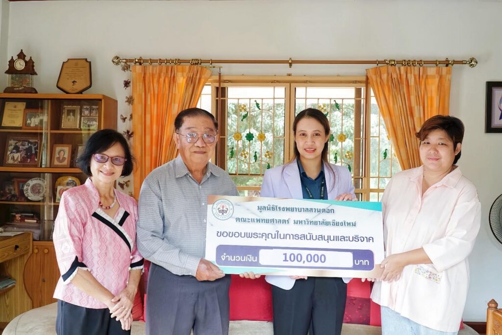 ผศ.พญ.ปัญจพร วงศ์มณีรุ่ง รองผู้อำนวยการ โรงพยาบาลมหาราชนครเชียงใหม่ คณะแพทยศาสตร์ มหาวิทยาลัยเชียงใหม่ รับมอบเงินบริจาค จำนวน 100,000 บาท จากคุณเทวินทร์ เลาหะเพ็ญแสง เนื่องในโอกาสวันคล้ายวันเกิด สมทบทุนมูลนิธิโรงพยาบาลสวนดอก เพื่อผู้ป่วยยากไร้
