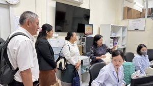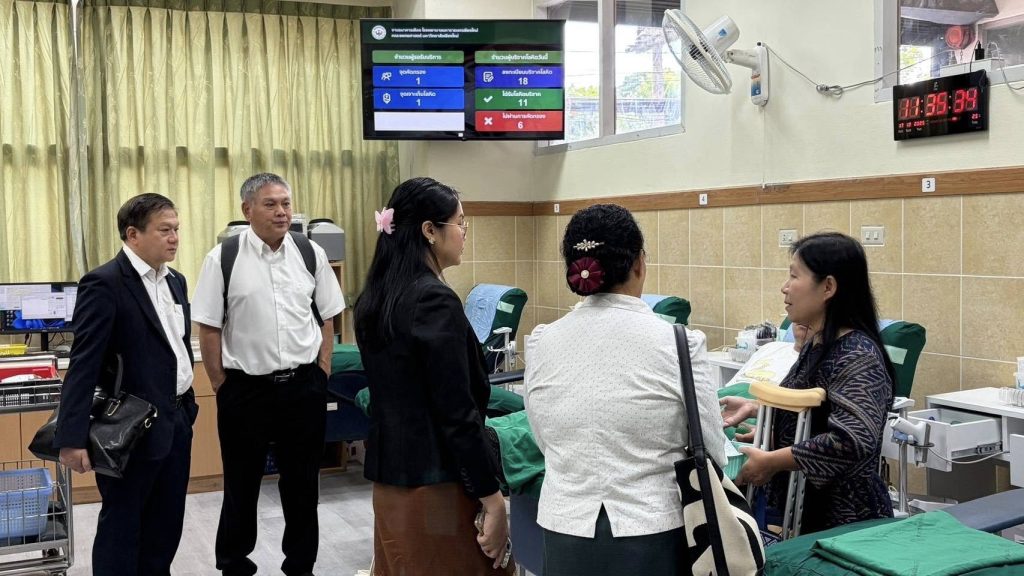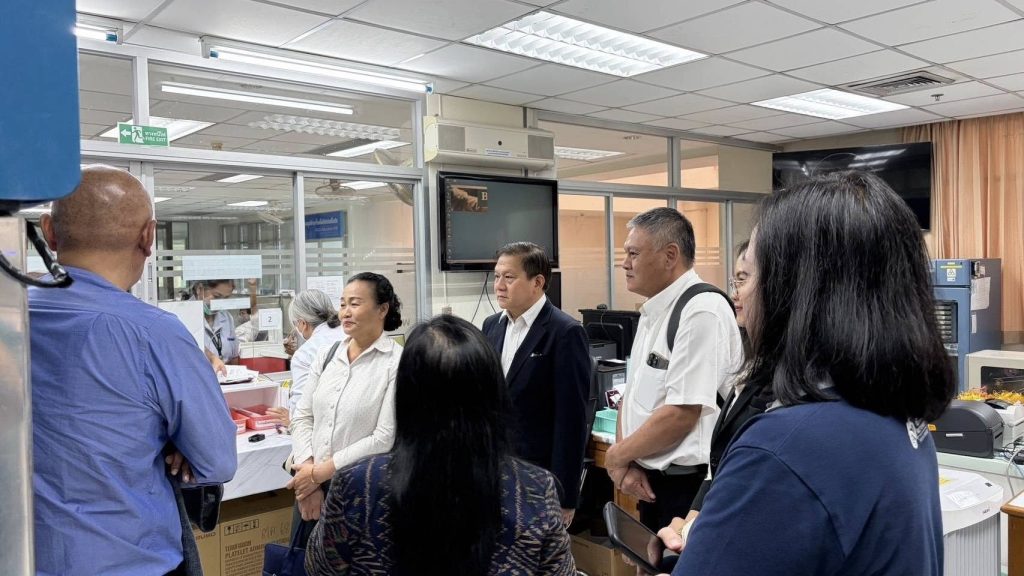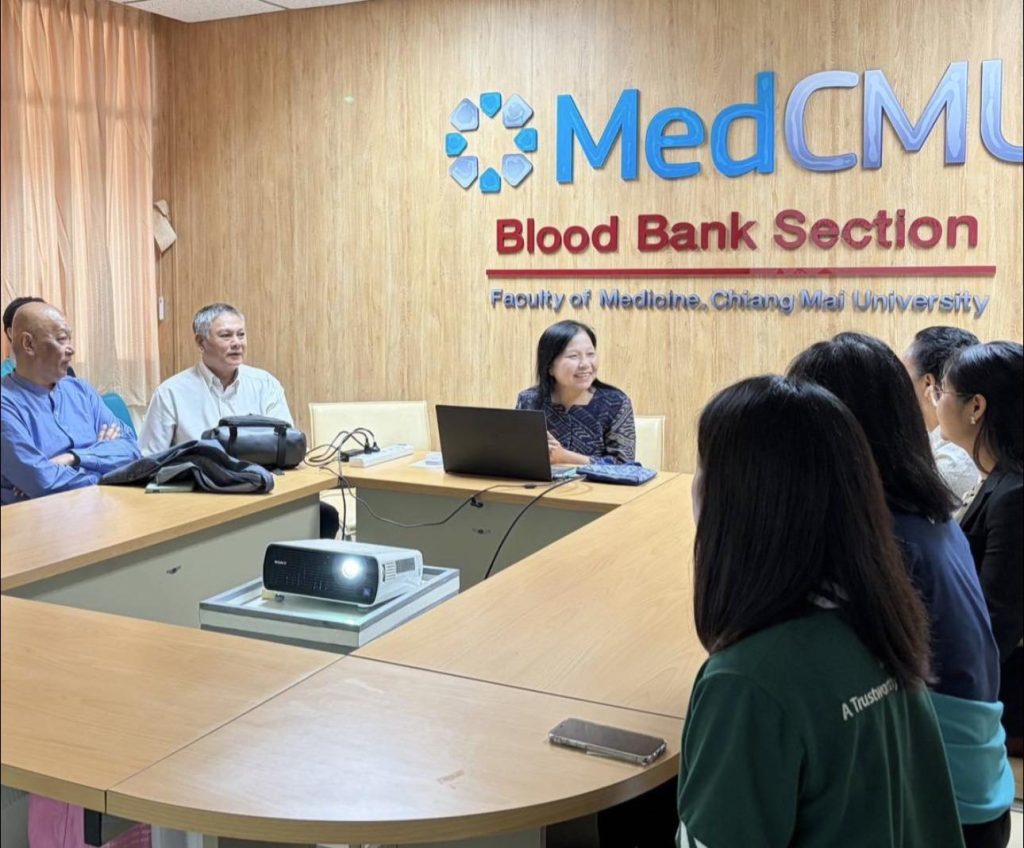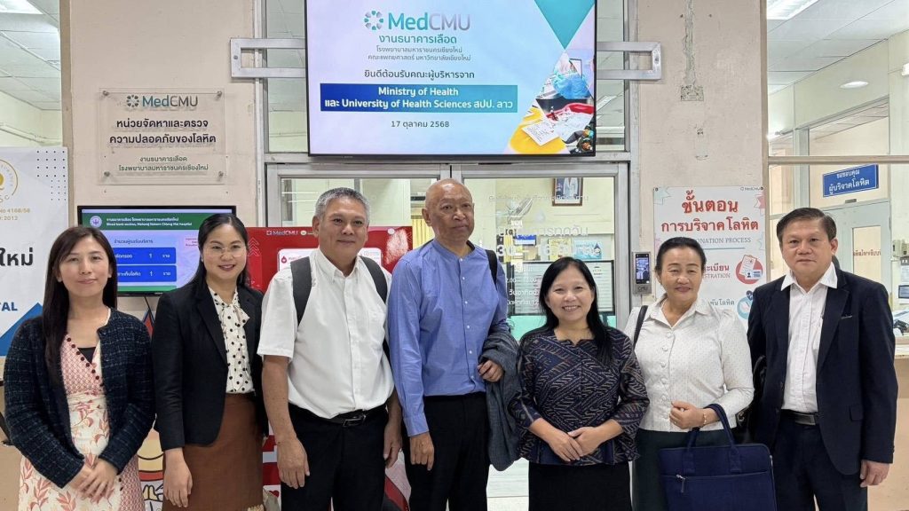 ผศ.นพ.กฤษณ์ ขวัญเงิน รองคณบดีด้านเทคโนโลยีสารสนเทศและบริหารจัดการข้อมูล คณะแพทยศาสตร์ มช. และ ทนพญ.ไพรจิตร ตานัน หัวหน้างานธนาคารเลือด โรงพยาบาลมหาราชนครเชียงใหม่ ให้การต้อนรับ คณะอาคันตุกะจาก Ministry of Health, Laos PDR และ University of Health Sciences, Laos นำโดย Assoc. Prof. Dr. Alongkone Phengsavanh, Dean of Faculty of Medicine จาก University of Health Sciences, Dr. Thongphout Xaysana, Deputy Director General, Department of Health Personnel จาก Ministry of Health