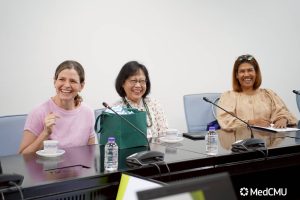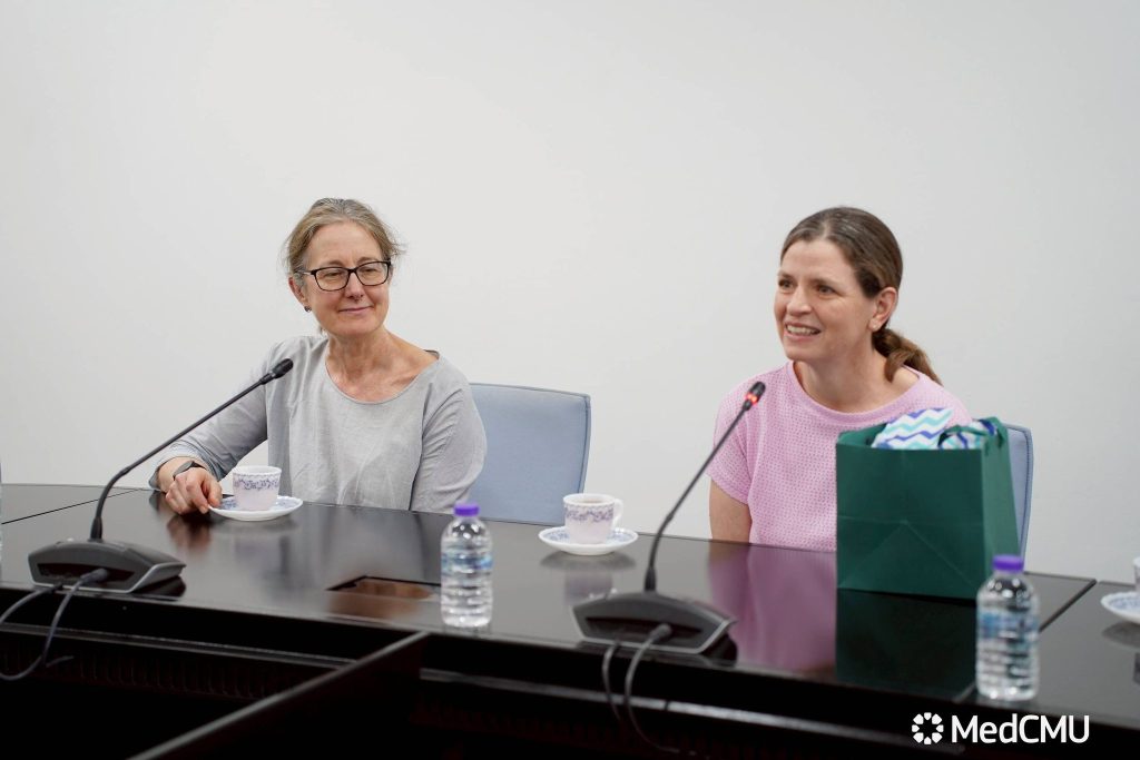รศ.ดร.นพ.ชัยสิริ อังกุรวรานนท์ ผู้ช่วยคณบดีด้านวิจัย นวัตกรรม และวิเทศสัมพันธ์ คณะแพทยศาสตร์ มช. ให้การต้อนรับ Prof. Emma Plugge, Professor of Public Health Primary Care, Population Sciences and Medical Education, Faculty of Medicine จากมหาวิทยาลัย Southampton, Dr. Gracia Fellmeth, Senior Clinical Research Fellow, Nuffield Department of Population Health จากมหาวิทยาลัย Oxford ประเทศ สหราชอาณาจักร และ Dr. Myo Thwin May, Social Scientist from Shoklo Malaria Research Unit (SMRU) จาก จังหวัดตาก ประเทศไทย