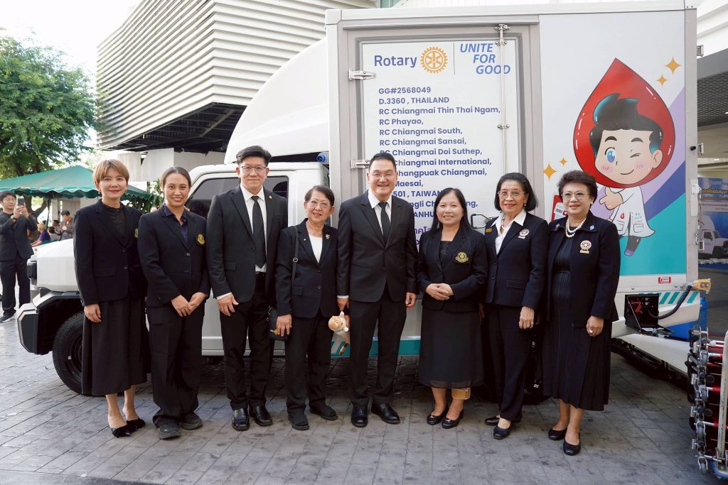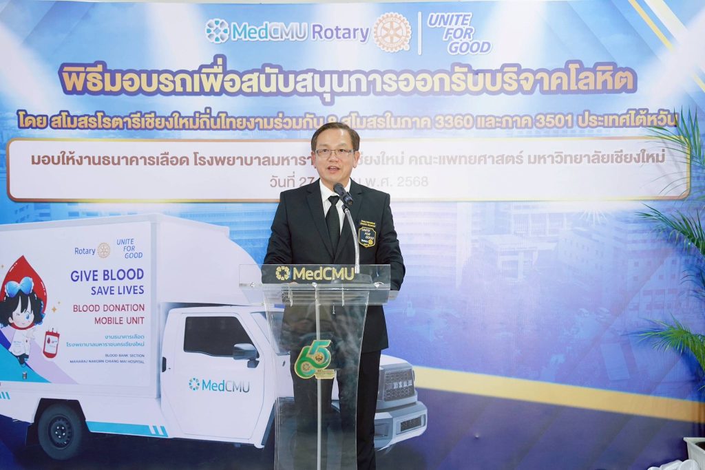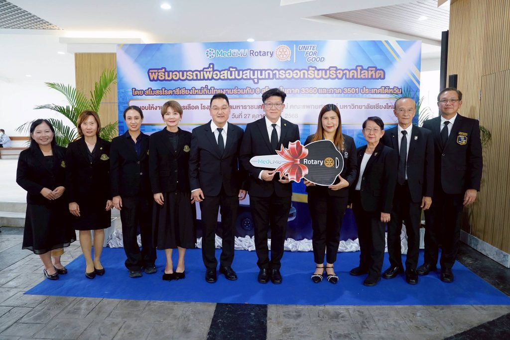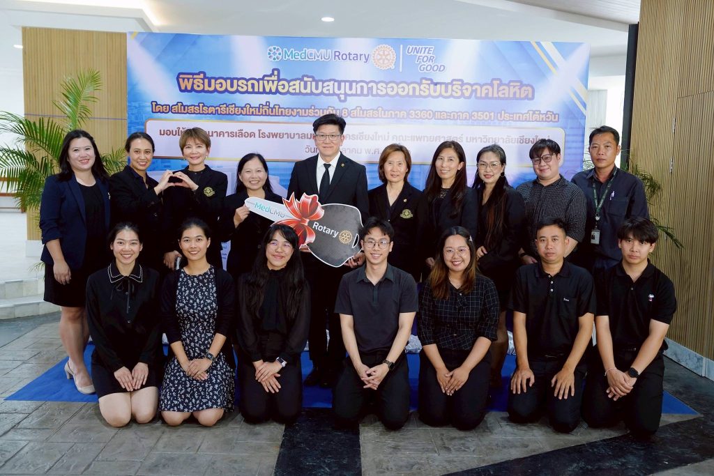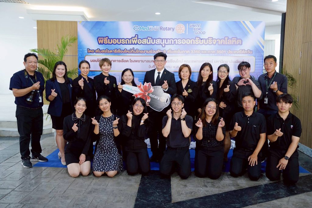 รศ.นพ.นเรนทร์ โชติรสนิรมิต คณบดี คณะแพทยศาสตร์ มช. พร้อมด้วย ศ.(เชี่ยวชาญพิเศษ)นพ.บรรณกิจ โลจนาภิวัฒน์ ที่ปรึกษาผู้ทรงคุณวุฒิ คณะแพทยศาสตร์ มช. ผศ.พญ.พุดตาน วงศ์ตรีรัตนชัย รองคณบดีด้านสื่อสารองค์กร คณะแพทยศาสตร์ มช. ผศ.พญ.ปัญจพร วงศ์มณีรุ่ง รองผู้อำนวยการโรงพยาบาลมหาราชนครเชียงใหม่ คุณมะลิวรรณ หินทอง เลขานุการคณะแพทยศาสตร์ มช. และคุณไพรจิตร ตานัน หัวหน้างานธนาคารเลือด รับมอบรถขนส่งโลหิตและอุปกรณ์ออกหน่วยรับบริจาคโลหิตจากสโมสรโรตารี เชียงใหม่ถิ่นไทยงาม สโมสรในภาค 3360 ประกอบด้วย สโมสรโรตารี่ช้างเผือกเชียงใหม่ สโมสรโรตารี่เชียงใหม่ใต้ สโมสรโรตารี่เชียงใหม่อินเตอร์เนชั่นแนล สโมสรโรตารี่พะเยา สโมสรโรตารี่เชียงใหม่สันทราย สโมสรโรตารี่เชียงใหม่ดอยสุเทพ สโมสรโรตารี่แม่สาย และภาค 3501 ประเทศไต้หวัน ณ โถงชั้น 1 อาคารสุจิณฺโณ คณะแพทยศาสตร์ มช.