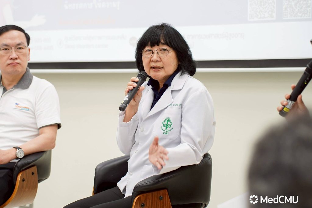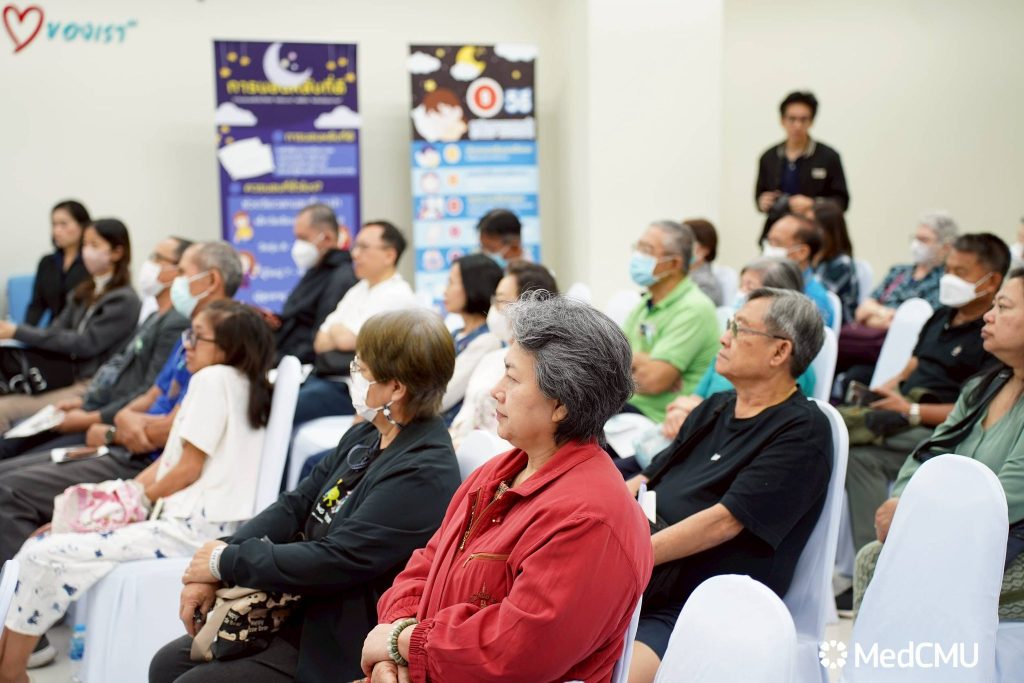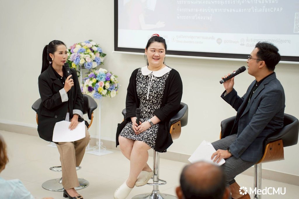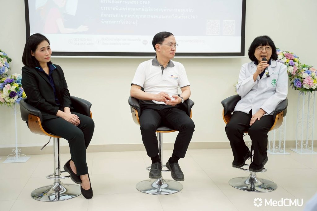 ภายในกิจกรรมมีการเสวนาในหัวข้อ “นอนหลับที่ดี เพื่อชีวีที่ดีกว่า” วิทยากรโดย รศ.พญ.กนกกาญจน์ สันกลกิจ อาจารย์ประจำภาควิชากุมารเวชศาสตร์ คณะแพทยศาสตร์ มช. และแพทย์ศูนย์วิเคราะห์ สุขภาพการนอนหลับ, รศ.นพ.ธีรกร ธีรกิตติกุล อาจารย์ประจำภาควิชาระบบการหายใจ เวชบำบัดวิกฤตและภูมิแพ้ ภาควิชาอายุรศาสตร์ คณะแพทยศาสตร์ มช. และหัวหน้าศูนย์วิเคราะห์สุขภาพการนอนหลับ และ ผศ.พญ.นันทพร ตียพันธุ์ อาจารย์ประจำภาควิชาอายุรศาสตร์ หน่วยระบบประสาทและสมอง พร้อม แลกเปลี่ยนประสบการณ์ จากผู้ใช้เครื่องอัดอากาศแรงดันบวก (CPAP) และบริการตรวจเช็คสภาพเครื่องโดยช่างจากบริษัทเครื่องมือแพทย์