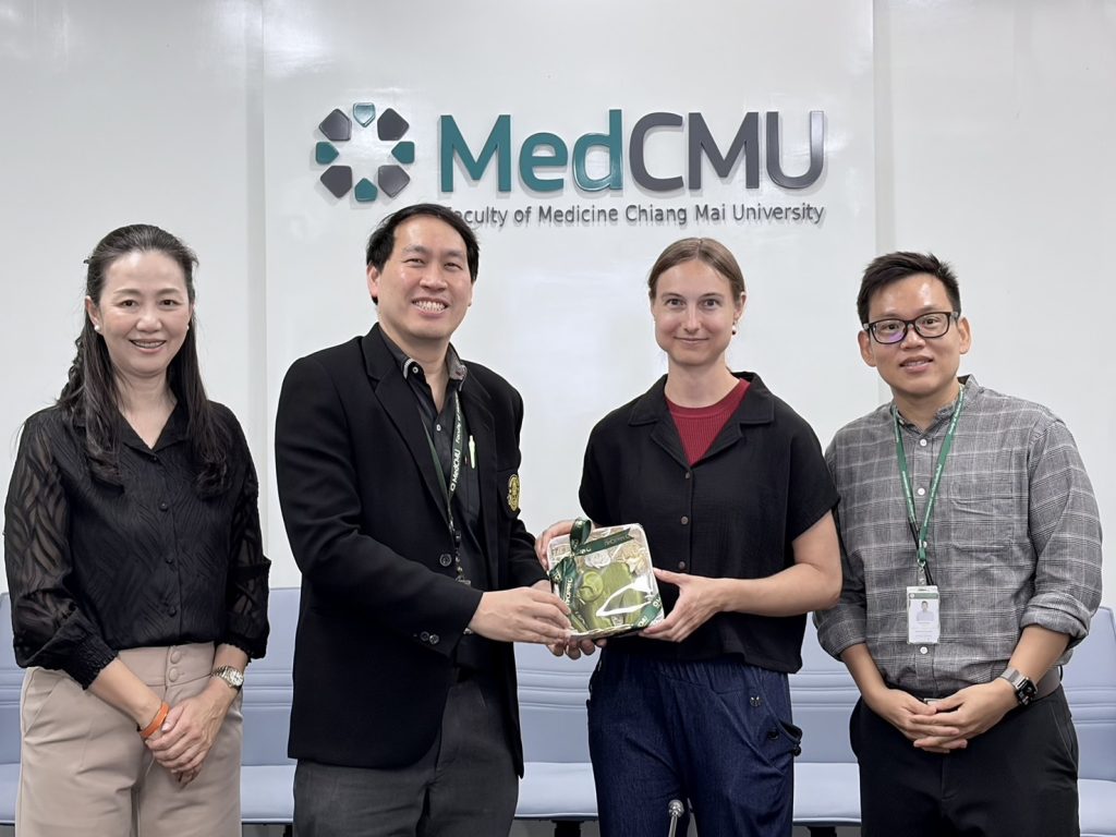 รศ.นพ.เอกรัฐ รัฐฤทธิ์ธำรง รองคณบดีคณะแพทยศาสตร์ มช. พร้อมด้วย ผศ.ดร.หทัยรัตน์ ธนัญชัย หัวหน้าภาควิชาจุลชีววิทยา และ ผศ.ดร.สมสกุล วงศ์ปาลีย์ อาจารย์ประจำภาควิชาจุลชีววิทยา ให้การต้อนรับ Ms. Kathrin Jäntsch, Biomedical Scientist จาก Diagnostic and Research Institute of Hygiene, Microbiology and Environmental Medicine at the Medical University of Graz ประเทศออสเตรีย