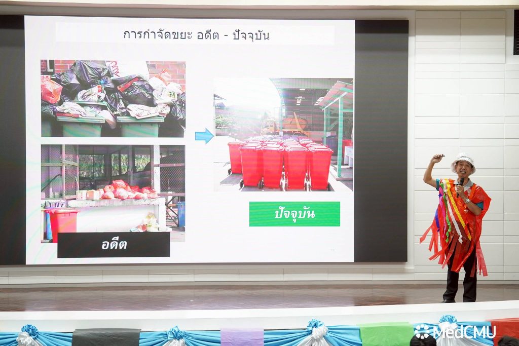 ในกิจกรรมฯ มีการบรรยายพิเศษ ในหัวข้อ “ทิศทางนโยบายการบริหารจัดการขยะ สู่การปฎิบัติอย่างเป็นรูปธรรม” วิทยากรโดย ผศ.ดร.นพ.ธวัชชัย มั่นอ่ำ รองคณบดีด้านกายภาพและสิ่งแวดล้อม และ หัวข้อ “HOW TO ทิ้ง แยกขยะอย่างไร ตามสไตล์คนสวนดอก” วิทยากรโดย คุณศรีทัย สีทิพย์ หัวหน้างานบริการกลางโรงพยาบาลมหาราชนครเชียงใหม่ นอกจากนี้ยังมี การประกวด “ชุดรีไซเคิล รังสรรค์แฟชั่นจากวัสดุเหลือใช้สู่รันเวย์”