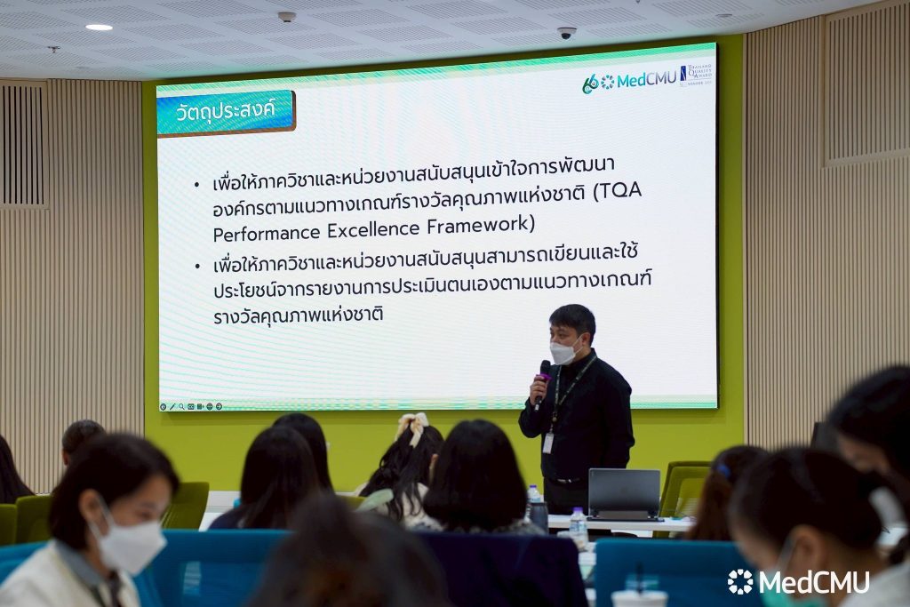 ผศ.นพ.เศรษฐพงศ์ บุญศรี รองคณบดีด้านการพัฒนาคุณภาพองค์กร คณะแพทยศาสตร์ มช. กล่าวต้อนรับ จัดการอบรมการเขียน SAR เพื่อรองรับการประเมินคุณภาพองค์กร ภายในคณะฯ ระดับภาควิชา และระดับหน่วยงานสายสนับสนุน