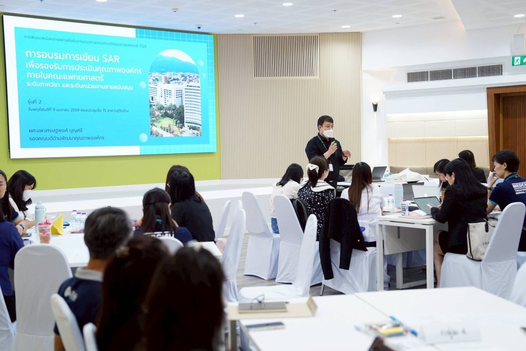 ผศ.นพ.เศรษฐพงศ์ บุญศรี รองคณบดีด้านพัฒนาคุณภาพองค์กร คณะแพทยศาสตร์ มช. กล่าวต้อนรับผู้เข้ารับการอบรมฯ การเขียน SAR เพื่อรองรับการประเมินคุณภาพองค์กร ภายในคณะฯ ระดับภาควิชา และระดับหน่วยงานสายสนับสนุน ซึ่งจัดให้มีในวันที่ 2 เมษายน และวันที่ 9 เมษายน 2569