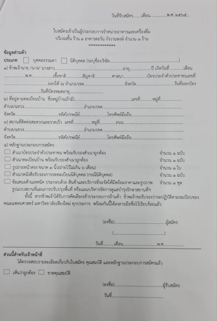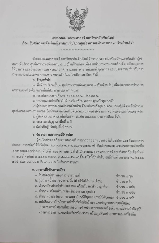 รับสมัครและคัดเลือกผู้เช่าสถานที่บริเวณศูนย์อาหารหอพักพยาบาล 9 (ร้านฝ้ายเดิม)