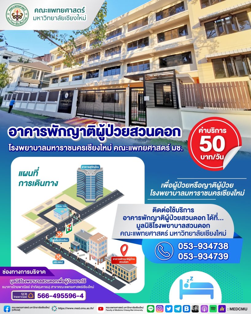 ติดต่อใช้บริการอาคารพักญาติผู้ป่วยสวนดอก ได้ที่…มูลนิธิโรงพยาบาลสวนดอก คณะแพทยศาสตร์ มหาวิทยาลัยเชียงใหม่ โทร. 053-934738, 053-934739