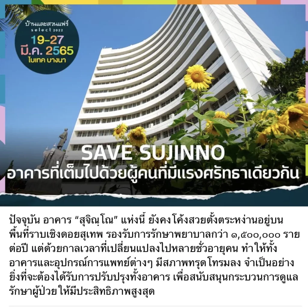 โครงการ “SAVE SUJINNO” โดย มูลนิธิโรงพยาบาลสวนดอก คณะแพทยศาสตร์ มหาวิทยาลัยเชียงใหม่ (official) มหาวิทยาลัยเชียงใหม่ จึงขอเชิญชวนผู้มีจิตศรัทธาร่วมบริจาค เพื่อปรับปรุงอาคารผู้ป่วยสุจิณฺโณ ผ่านทาง