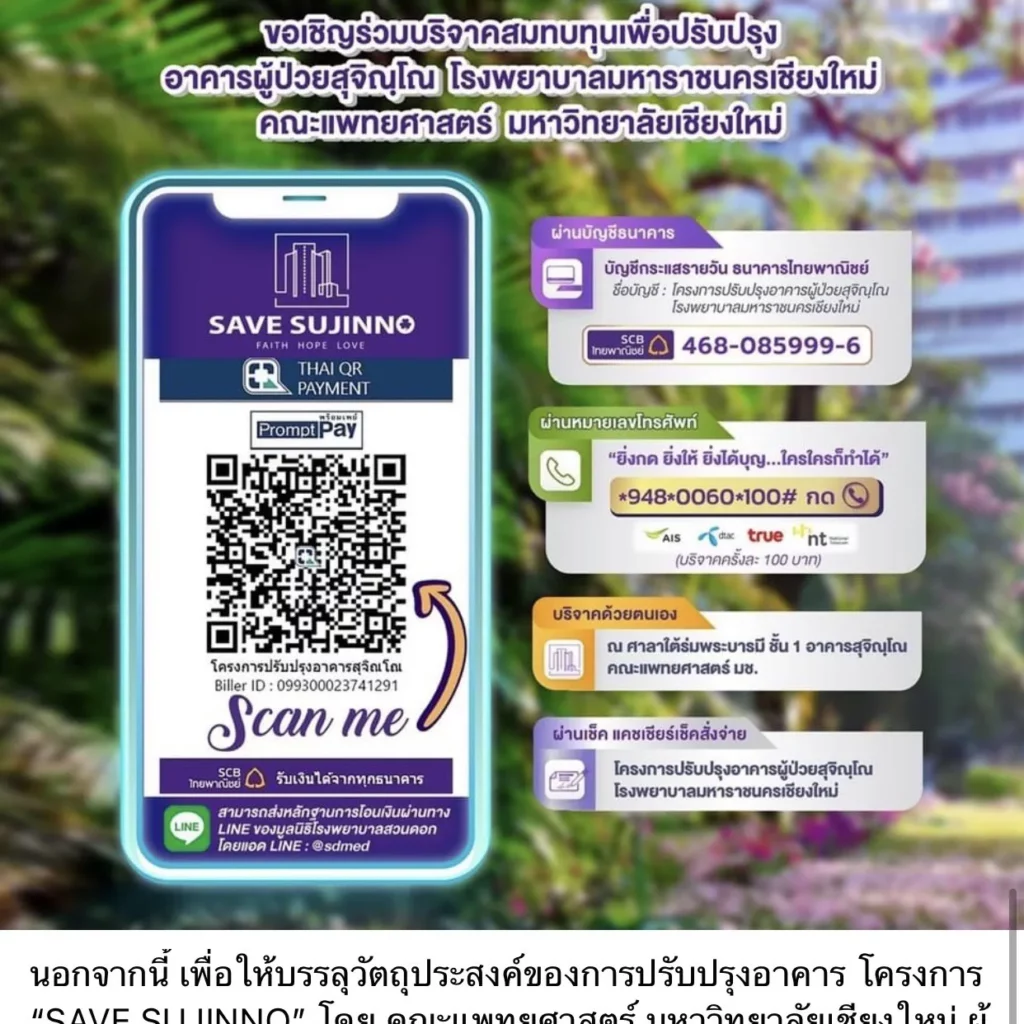 ๐ โอนเงินผ่านธนาคารไทยพาณิชย์ จำกัด (มหาชน) สาขาคณะแพทยศาสตร์ เชียงใหม่ ชื่อบัญชี โครงการปรับปรุงอาคารผู้ป่วย “สุจิณฺโณ” โรงพยาบาลมหาราชนครเชียงใหม่ เลขบัญชี ๔๖๘-๐-๘๕๙๙๙-๖ (ใบเสร็จสามารถลดหย่อนภาษีได้)