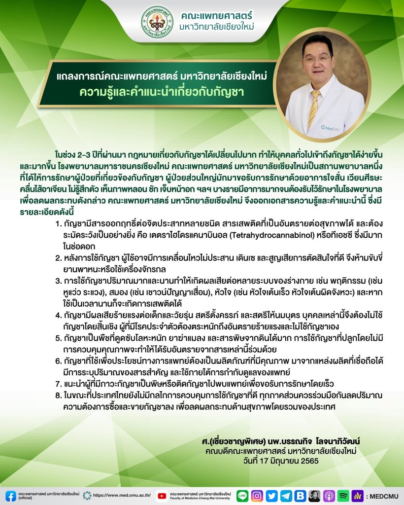 ในช่วง 2-3 ปีที่ผ่านมา กฎหมายเกี่ยวกับกัญชาได้เปลี่ยนไปมาก ทำให้บุคคลทั่วไปเข้าถึงกัญชาได้ง่ายขึ้นและมากขึ้น โรงพยาบาลมหาราชนครเชียงใหม่ คณะแพทยศาสตร์ มหาวิทยาลัยเชียงใหม่เป็นสถานพยาบาลหนึ่งที่ได้ให้การรักษาผู้ป่วยที่เกี่ยวข้องกับกัญชา ผู้ป่วยส่วนใหญ่มักมาขอรับการรักษาด้วยอาการใจสั่น เวียนศีรษะคลื่นไส้อาเจียน ไม่รู้สึกตัว เห็นภาพหลอน ชัก เจ็บหน้าอก ฯลฯ บางรายมีอาการมากจนต้องรับไว้รักษาในโรงพยาบาลเพื่อลดผลกระทบดังกล่าว คณะแพทยศาสตร์ มหาวิทยาลัยเชียงใหม่ จึงออกเอกสารความรู้และคำแนะนำนี้ ซึ่งมีรายละเอียดดังนี้