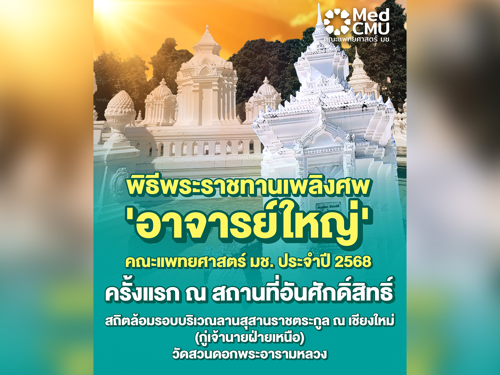 พิธีพระราชเพลิงศพอาจารย์ใหญ่ คณะแพทยศาสตร์ มช. ประจำปี 2568 ครั้งแรก ณ สถานที่อันศักดิ์สิทธิ์ สถิตล้อมรอบบริเวณลานสุสานราชตระกูล ณ เชียงใหม่ (กู่เจ้านายฝ่ายเหนือ) วัดสวนดอกพระอารามหลวง