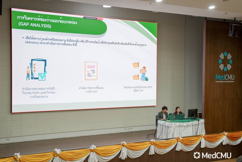 ผศ.ดร.นพ.ภูวพงศ์ นิ่มกิ่งรัตน์ ผู้ช่วยคณบดีด้านเทคโนโลยีสารสนเทศและบริหารจัดการข้อมูล คณะแพทยศาสตร์ มช. เป็นประธานเปิดโครงการอบรมเชิงปฏิบัติการ ยกระดับการใช้งานระบบบริหารจัดการข้อมูลส่วนบุคคล (PDPA)